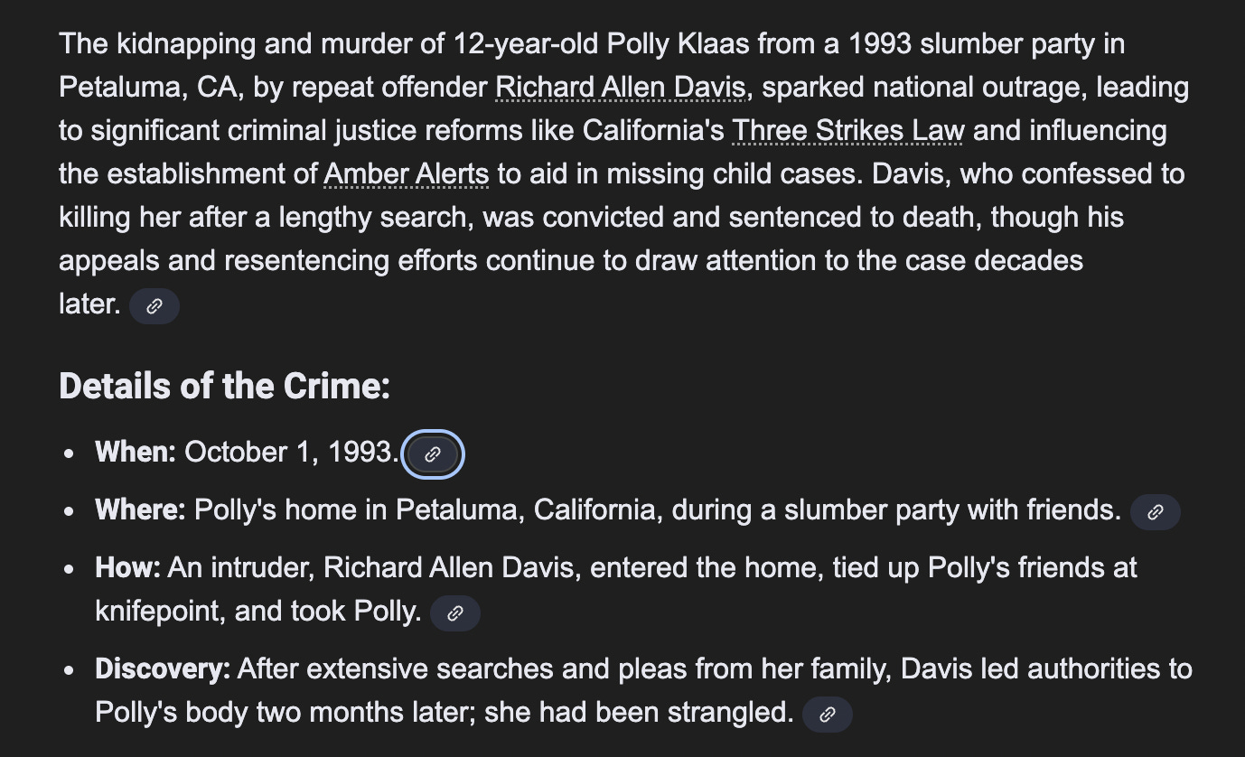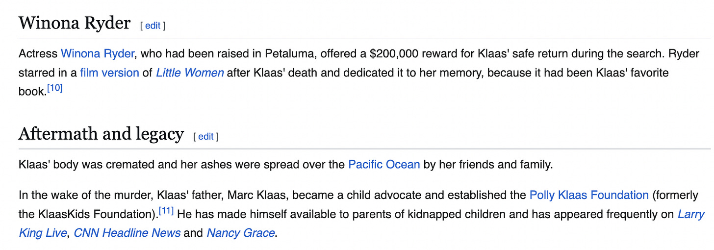 Winona Ryder, a Petaluma-native, became an advocate for the missing teen during the search. She even has an entry in the Polly Klaas wikipedia (a surprisingly thin article imo).