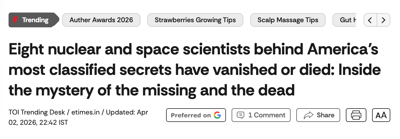 EIGHT SPACE SCIENTISTS BEHIND AMERICA’S SPACE PROGRAM VANISHED OR DIED: INSIDE THE MYSTERY (TIMES OF INDIA)